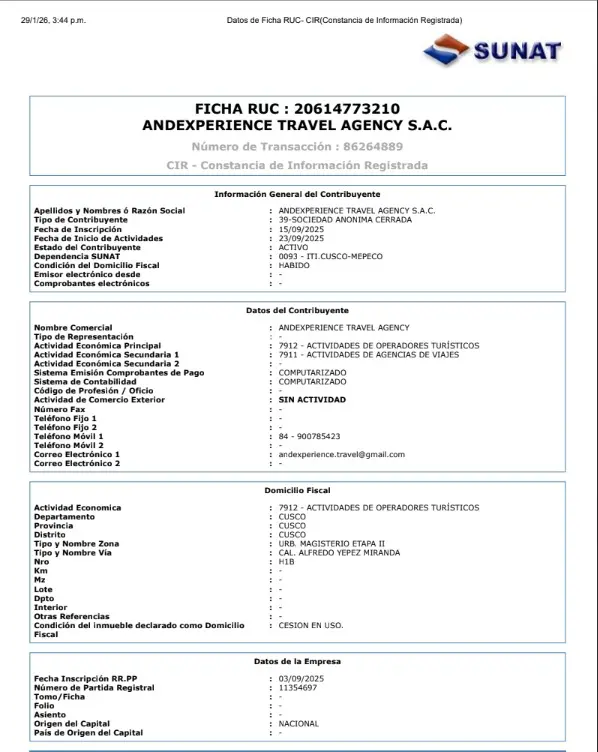 andeXperience Travel is a fully registered and formal company, operating in strict compliance with SUNAT (National Superintendence of Customs and Tax Administration). Our adherence to all fiscal and administrative regulations reflects our commitment to transparency and professional excellence in the Peruvian tourism industry.