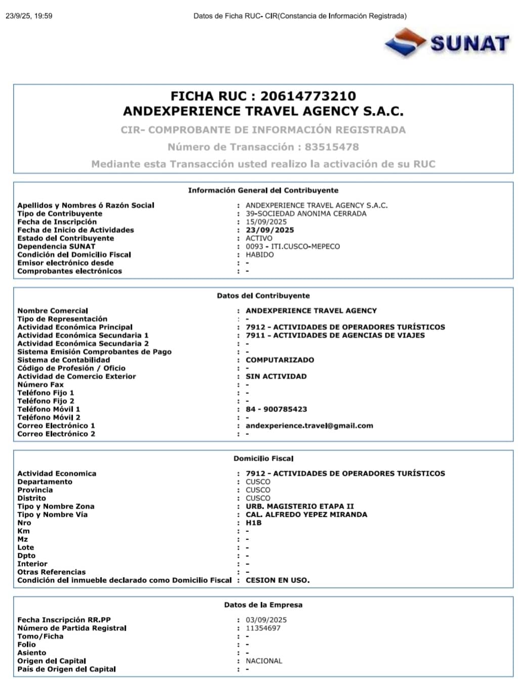 Razón social: Andexperience Travel Agency S.A.C.